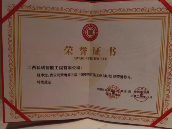 江西科瑞智能工程有限公司作為省內安防行業的領軍企業,這是繼第一、二、三、四屆之后,再次榮獲“中國安防百強工程(集成)商”榮譽稱號!